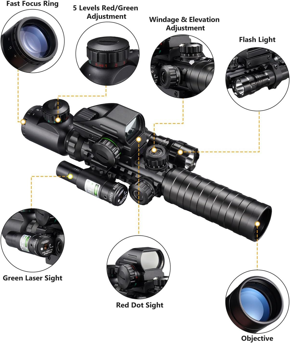 Combo Optic Systems$179.98Rated 4.56 out of 5MidTen 3-9×32 5-in-1 Scope Combo with Dual Illuminated Rangefinder Reticle Scope, Laser Sight, Red Dot Sight, Flashlight with 20mm Mount, Green : Sports & Outdoors